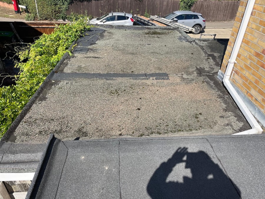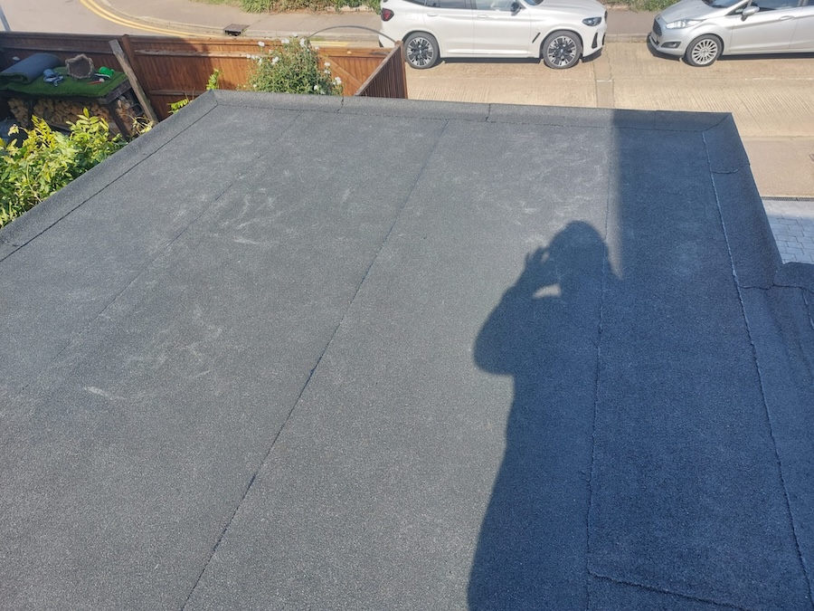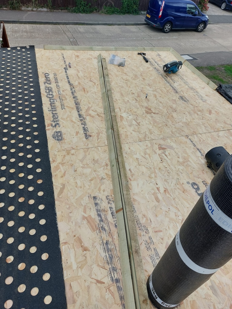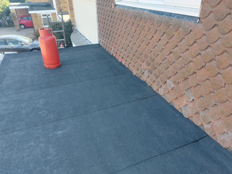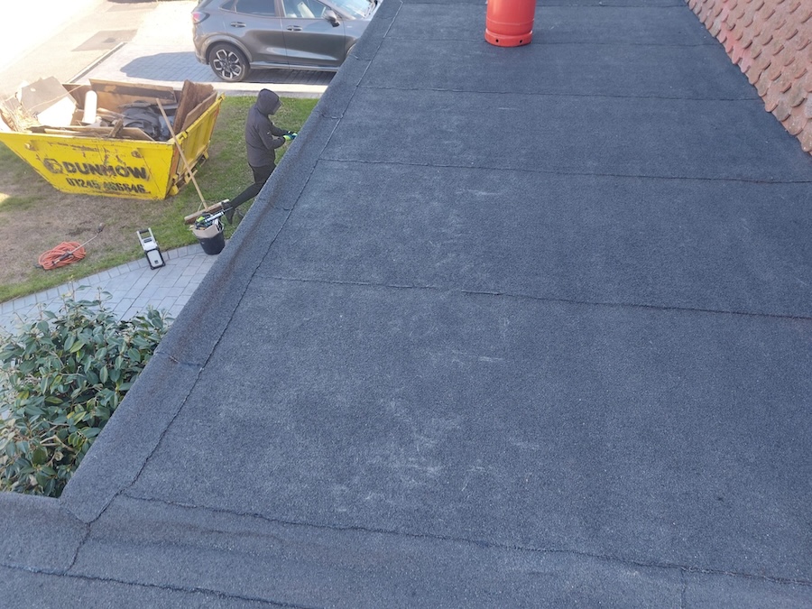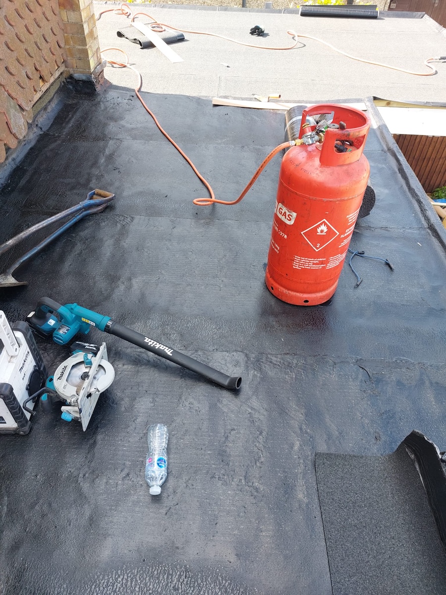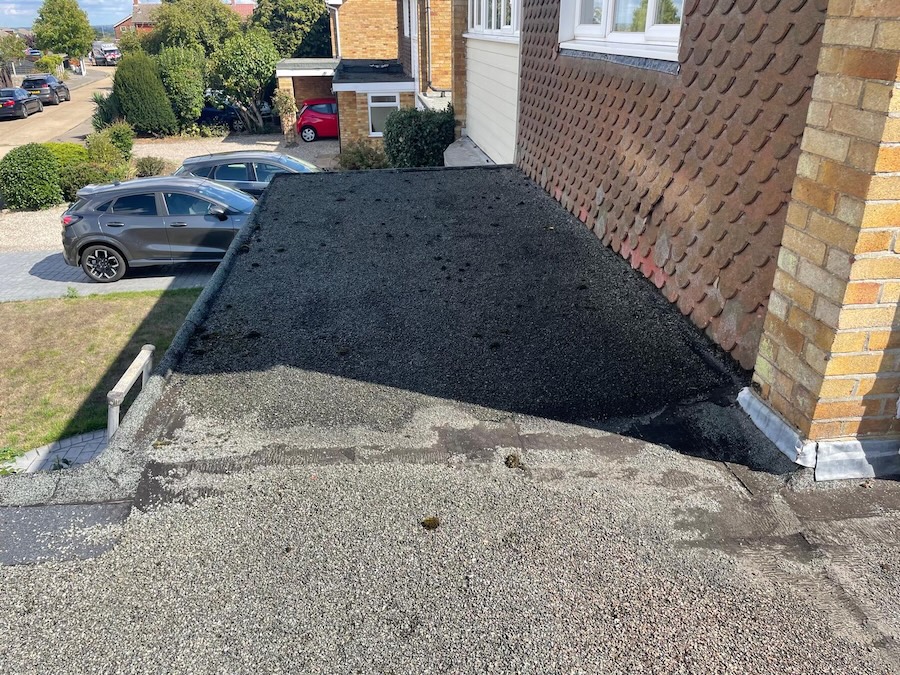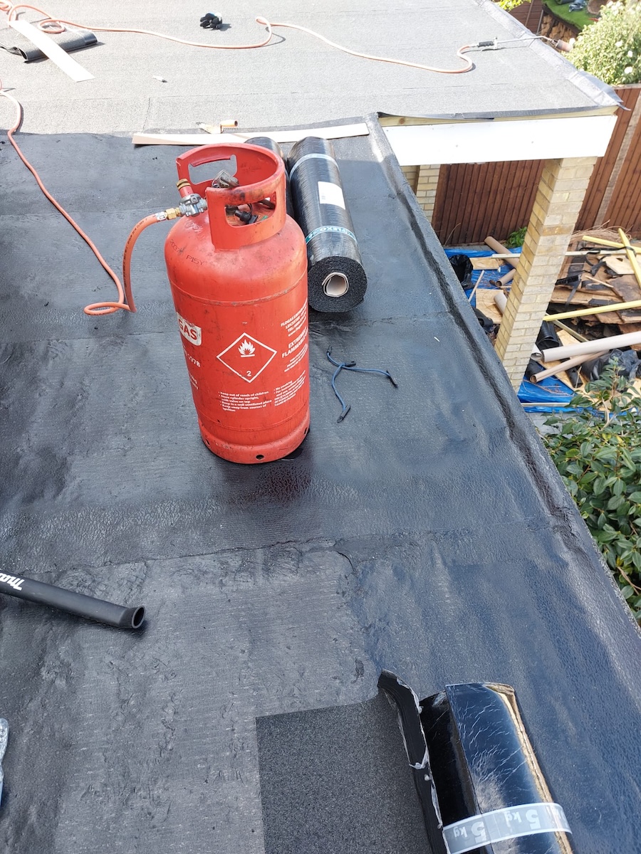 Keenan Roofing were contracted to replace an old failed flat roof in Galleywood, Chelmsford. We stripped up then redecked with an 18mm OSB then built a 3 layer high performance torch on built up felt roof system which we supplied and installed. New roof / roof replacement / strip and relay / flat roof replacement / 3 layer felt roof